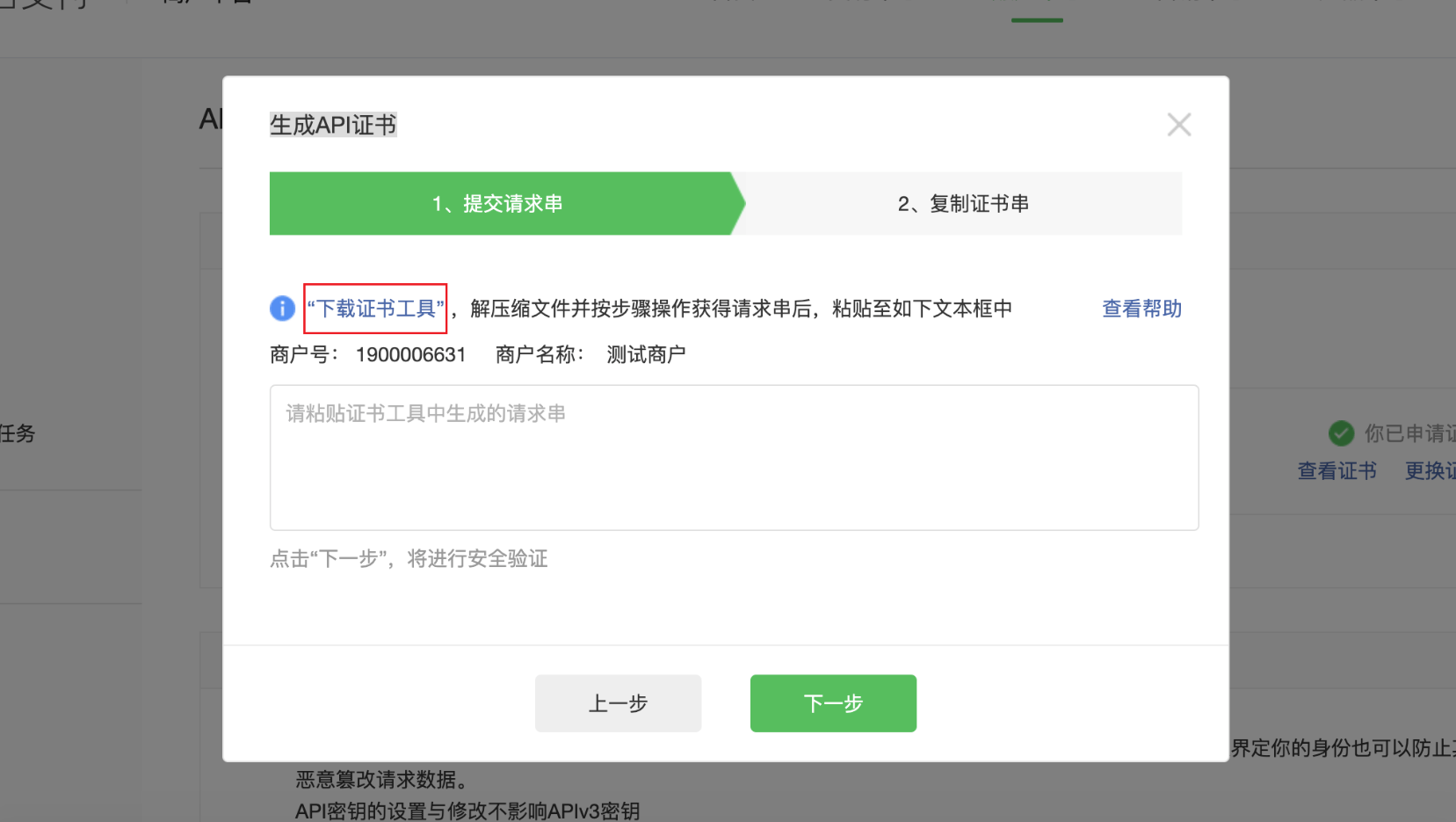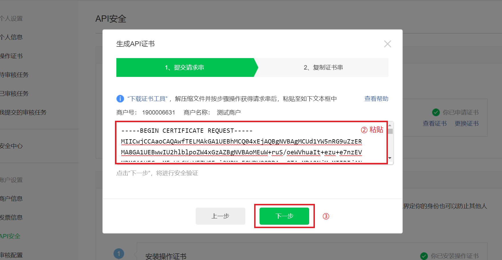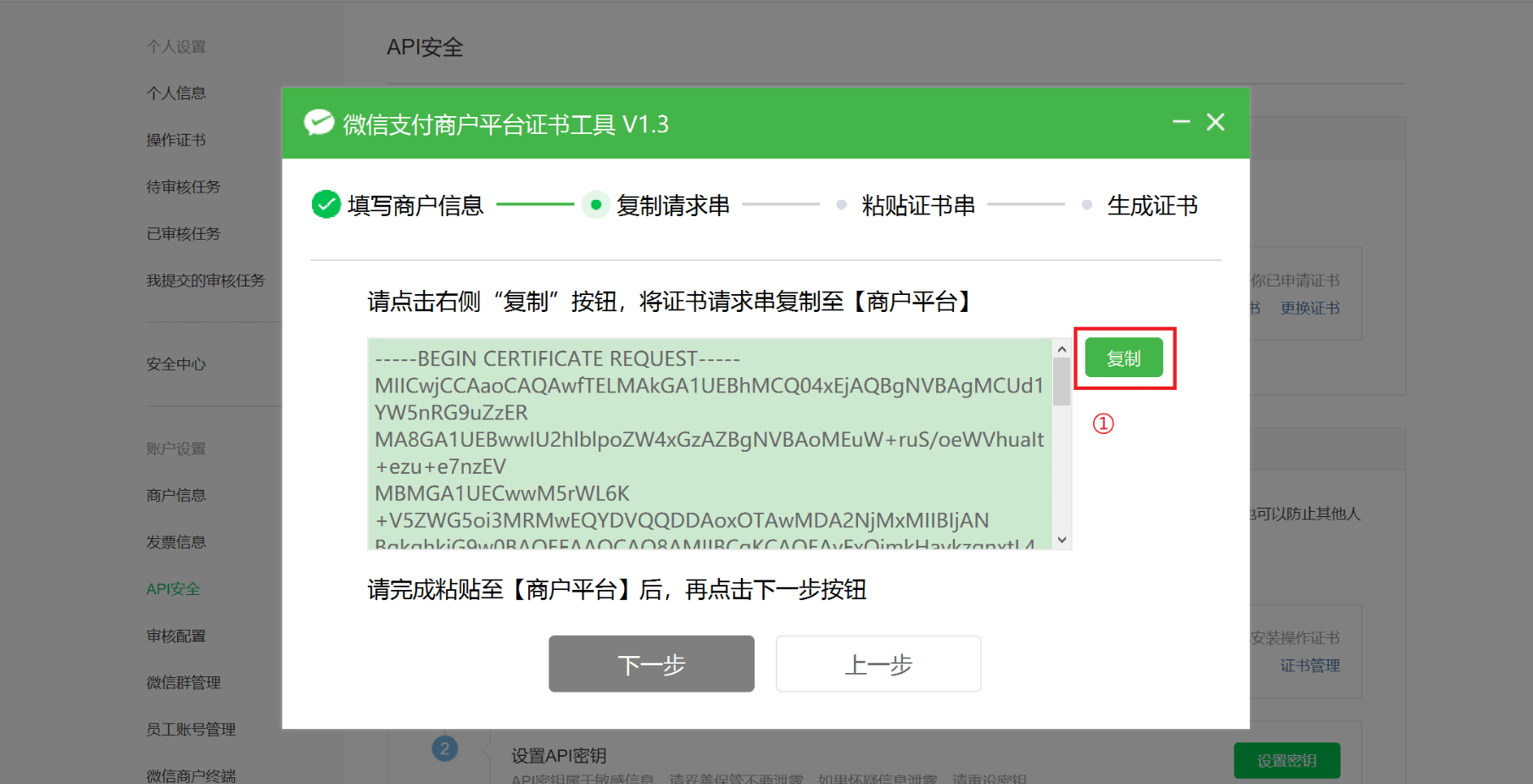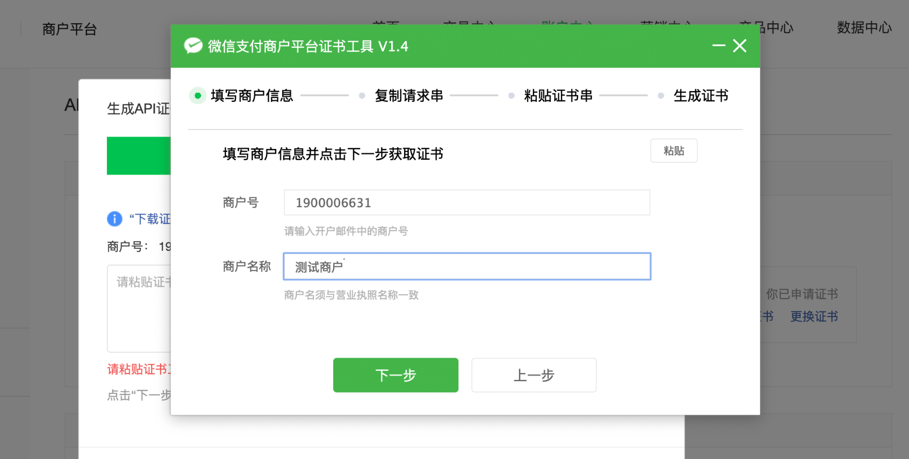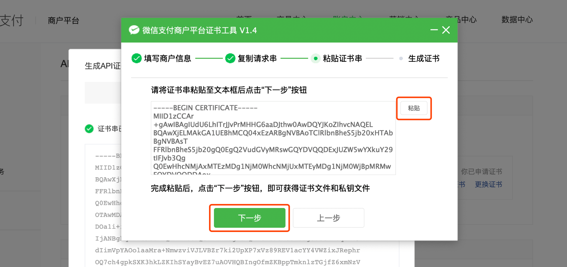 在证书工具中,将复制的商户信息粘贴并点击 下一步 。