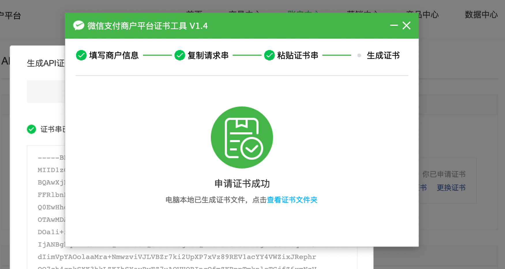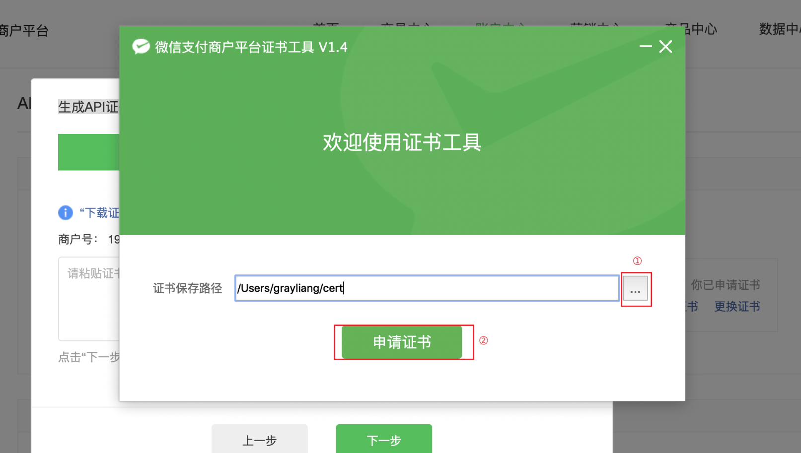 商户API私钥存储在本地微信商户平台证书中,如本地无证书,请先按照下面的流程生成微信商户平台证书。