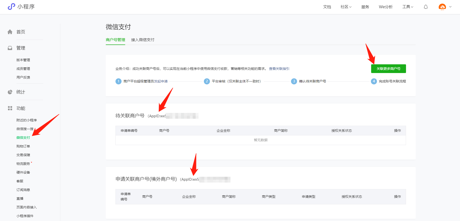 点击左侧菜单 功能 - 微信支付 - 关联更多商户号 即可开始绑定流程。绑定所需的 AppID 信息将在页面直接呈现。