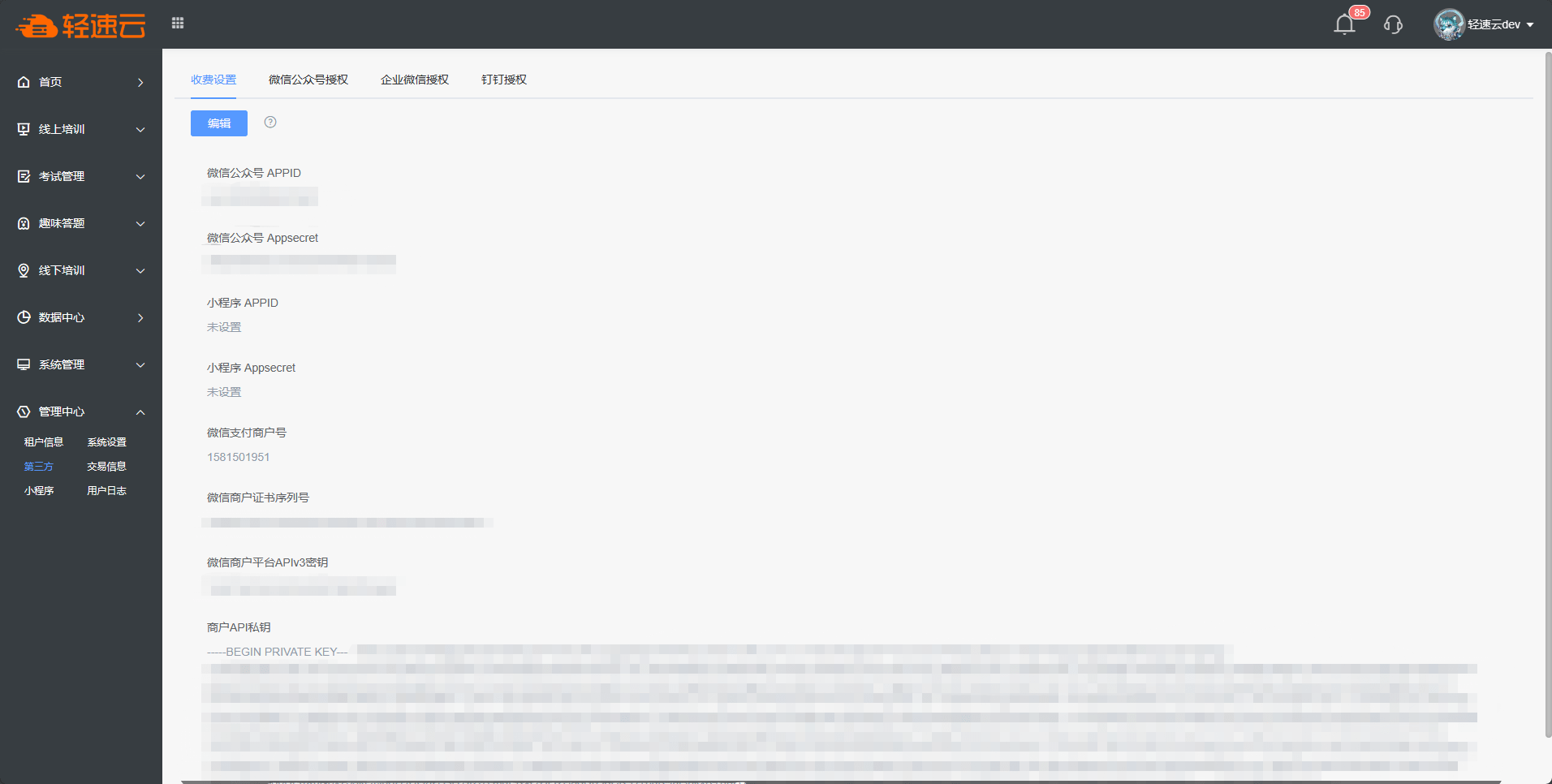 系统内所有支付相关功能需通过 管理中心 - 第三方设置 - 收费设置 进行必要配置后才能使用,请按照下述流程逐步进行。