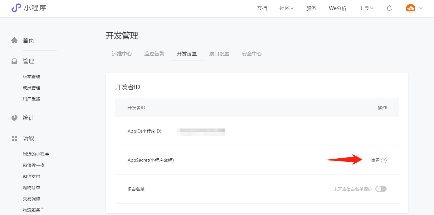 在开发设置页面,能够查看 AppID 和 AppSecret 。如果忘记了,可以点击重置,重新获取新密码。