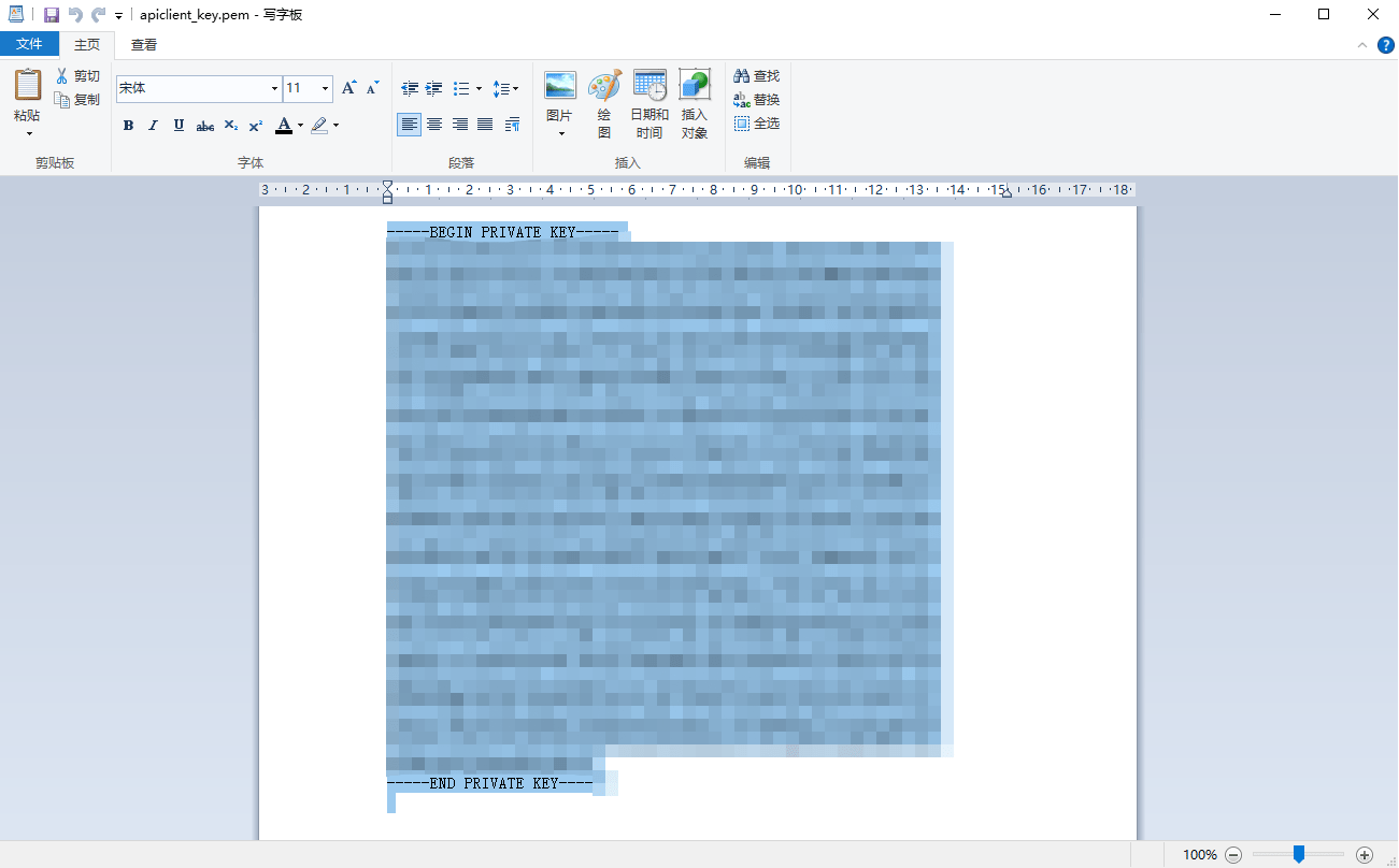 访问证书生成路径,能够找到一个压缩包,使用记事本等文档读取类软件打开其中名为 apiclient_key.pem 的文件。