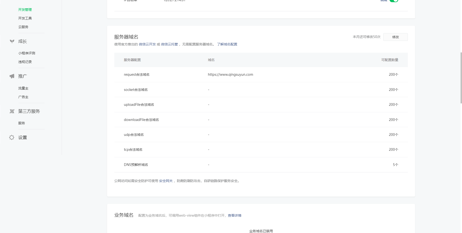点击 开发管理 - 开发设置 ,在 服务器域名 中填写 request合法域名 ,以及 业务域名 。