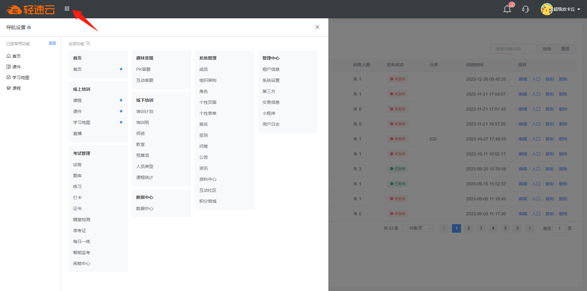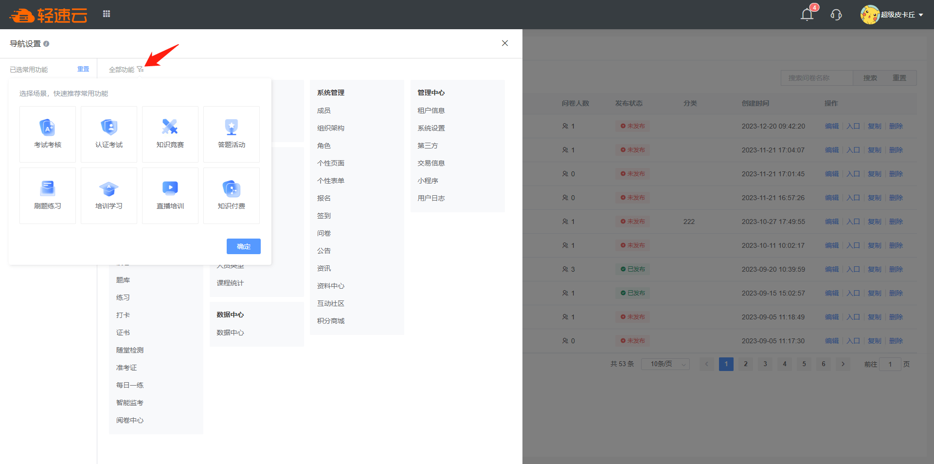 点击顶部的设置按钮,选择需要展示的菜单即可。