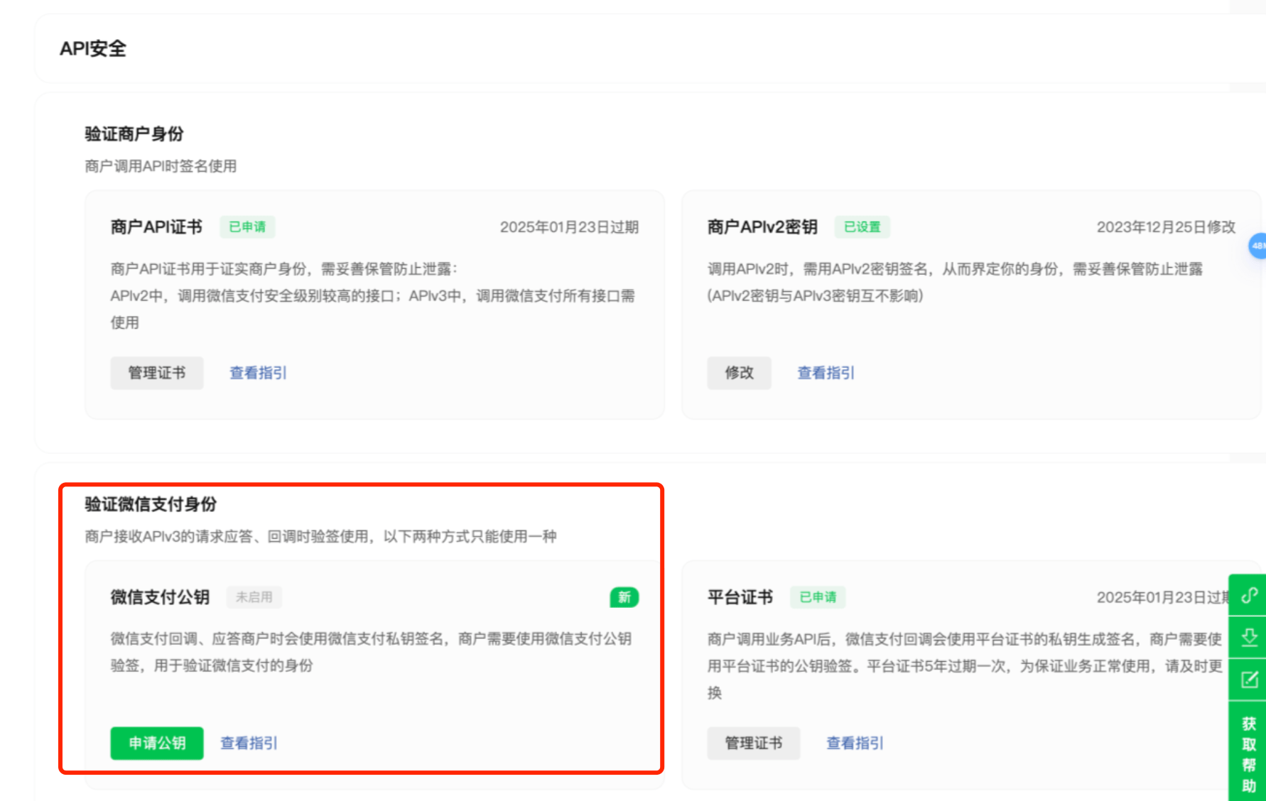 目前微信支付流程中,需要在平台证书和微信支付公钥中二选一使用。如果您的支付流程中需要使用该信息,则可以在 微信商户平台 的 API安全 页面获取微信支付公钥信息。