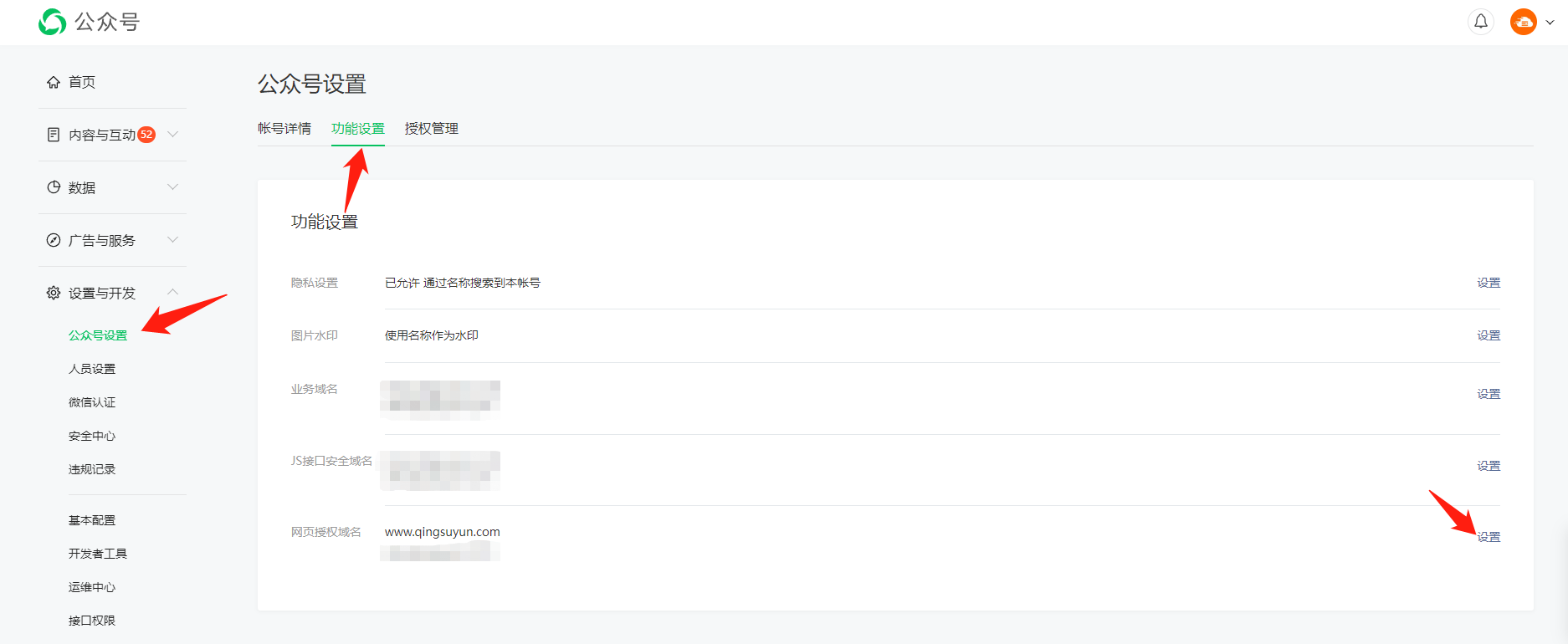 登录 微信公众平台 ,点击左侧菜单 设置与开发 - 公众号设置 ,然后点击顶部的 功能设置 。