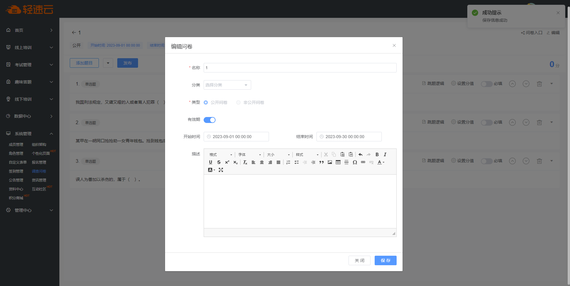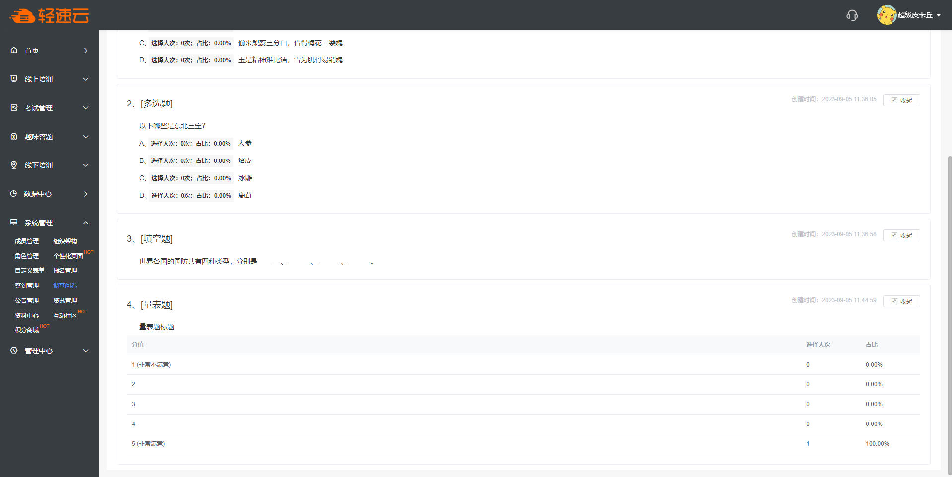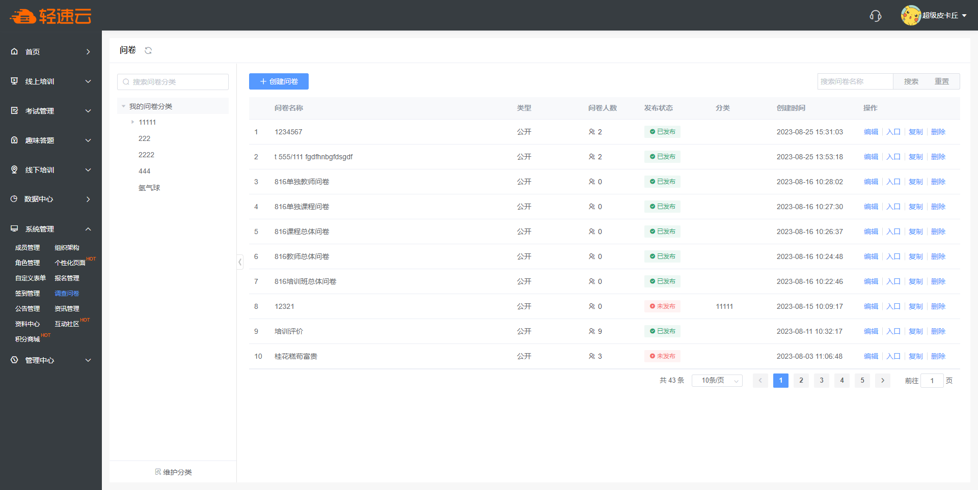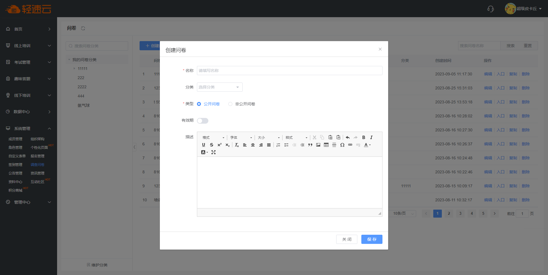 在管理后台左侧 系统管理 栏目中找到 调查问卷 ,能够进行问卷管理,列表中会展示所有已创建的问卷信息。