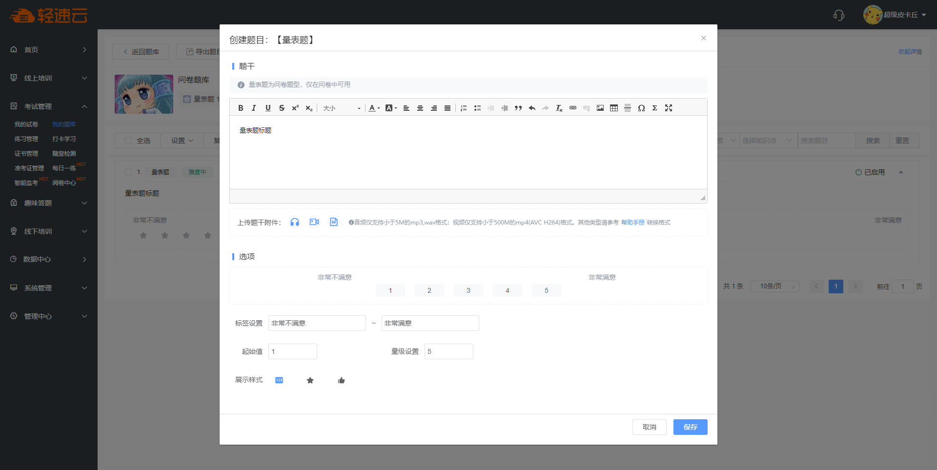 调查问卷中使用的题目信息来自于题库,因此需要预先在题库中添加题目信息。