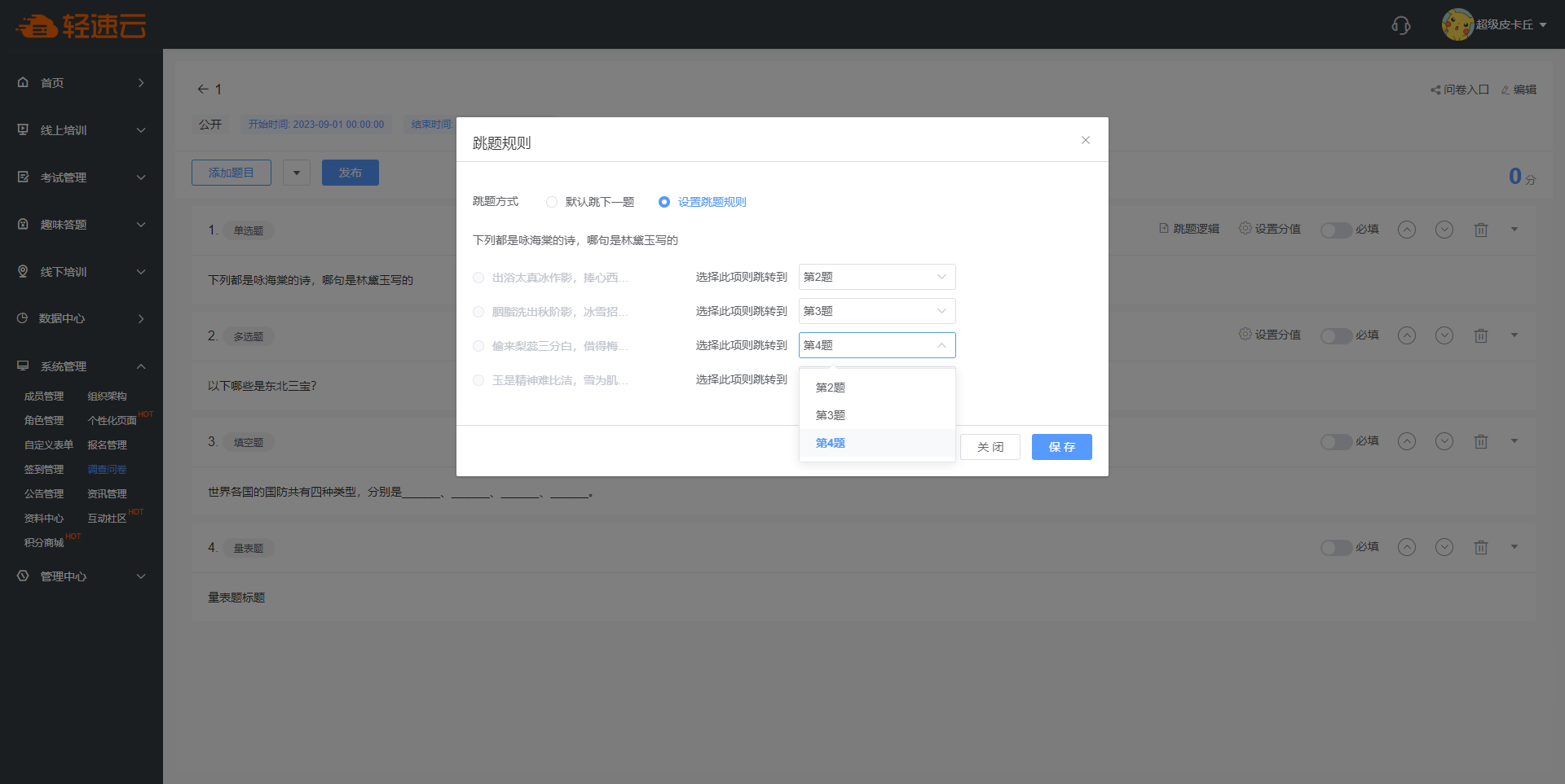 添加到试卷中的 单选题 和 多选题 具有额外的规则设置,例如选项能够设置分值,系统会根据各选项的得分计算出调查问卷的总分。