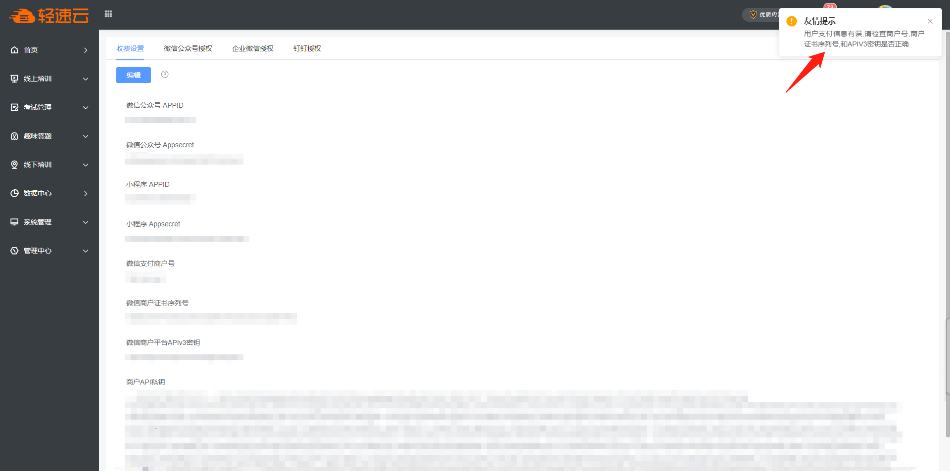 查看到对应提示信息时,可根据 自有收款设置 重新获取配置信息,并将其填写到kaiyun体育官方网站手机网管理后台。
